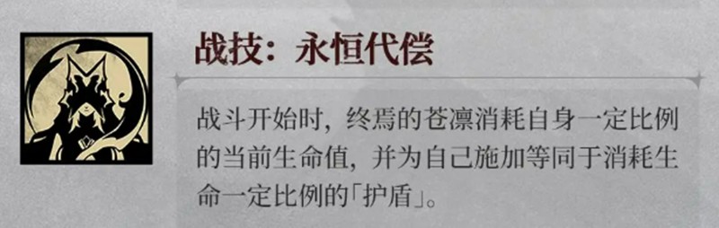 战技永恒代偿是苍凛的核心技能之一。通过消耗生命值来获得护盾,虽然有一定风险但能快速进入战斗状态。合理使用这个技能可以在关键时刻获得足够的防护,提升持续作战能力。在敌人猛攻时,这个护盾能让她安然度过危险期。