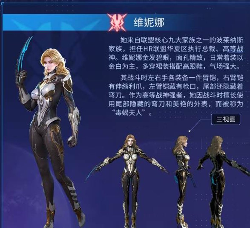 维妮娜以其金发碧眼、面孔精致和日常着装以金白为主的形象著称。她在战斗时左右手各装备一件臂铠,右臂铠有伸缩利爪,左臂铠藏有枪口,尾部还隐藏着弯刀。作为高等战神强者,她因战斗时擅长使用尾部隐藏的弯刀和美艳的外表,而被称为“毒蝎夫人”。
