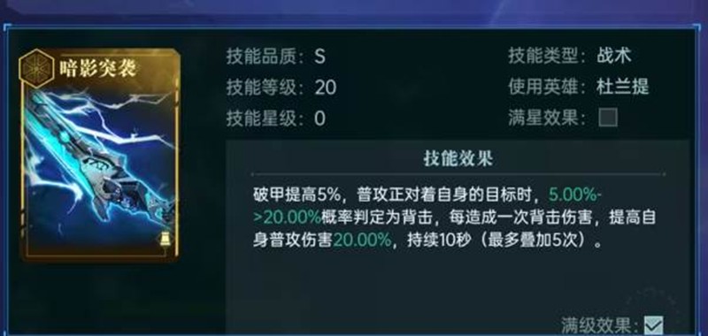 杜兰提的暗影突袭:破甲提高5%,普攻正对着自身的目标时,5.00%->20.00%概率判定为背击,每造成一次背击伤害,提高自身普攻伤害20.00%,持续10秒(最多叠加5次)。