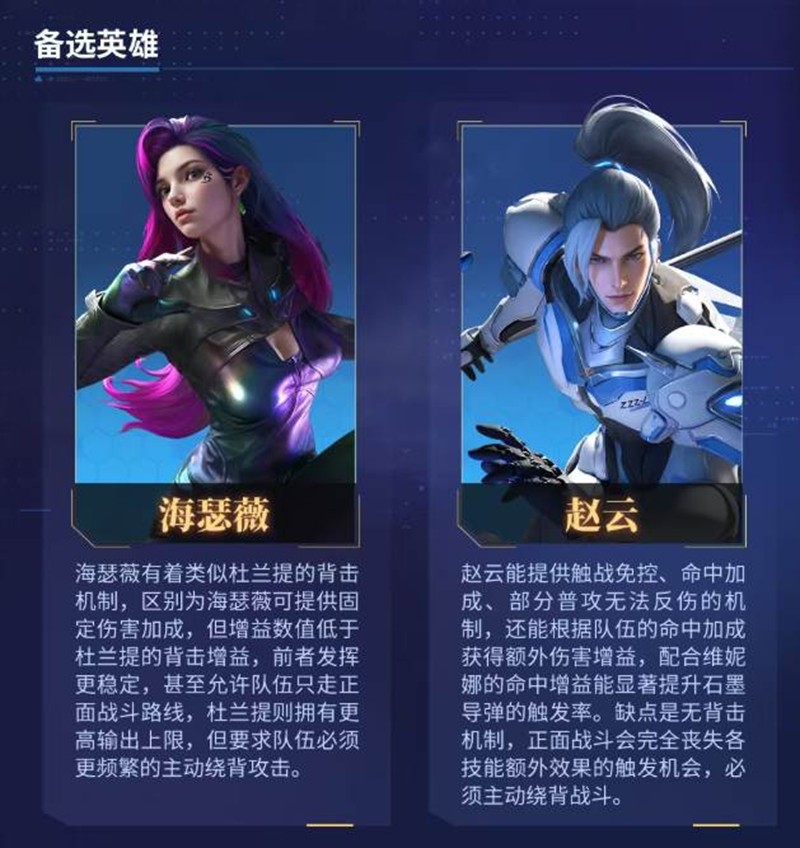 赵云:能提供触战免控、命中加成、部分普攻无法反伤的机制,还能根据队伍的命中加成获得额外伤害增益,配合维妮娜的命中增益能显著提升石墨导弹的触发率。缺点是无背击机制,正面战斗会完全丧失各技能额外效果的触发机会,必须主动绕背战斗。