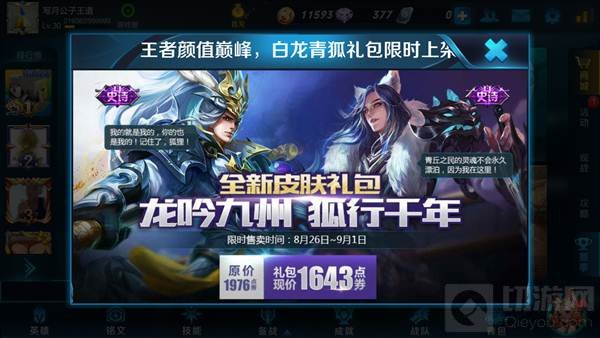 王者荣耀白龙青狐全新官方CP皮肤正式上线,两款史诗级皮肤打包带走,白龙青狐礼包包含两款皮肤,分别是韩信的白龙吟和李白的千年之狐。土豪们上手的机会来了。
