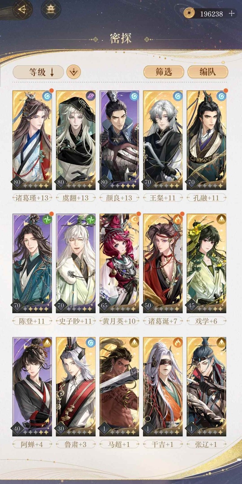 4.密探集中养成,不要抽一个养一个,先确保有一队主力通关主线,再根据高难关卡对应拉人。优先给主c升级,其次是升级收益大的,漆园蝶也是同理。举个例子,主c的攻击蝶要优先点满,但是生命蝶第一分配给颜良。为什么?因为颜良每10滴血量就是全队的1点盾,加上修为星石等等,再搭配孔融的话,可以说颜良的练度等于全队的生存,而给主c喂生命只能保住自己,但不是说不用点,等真正卡关缺生命的时候,再点上去。再比如王粲和孔融都是奶,在站得住的情况下优先升王粲,因为孔融奶量与自身练度无关,但王粲攻击越高盾奶越高。