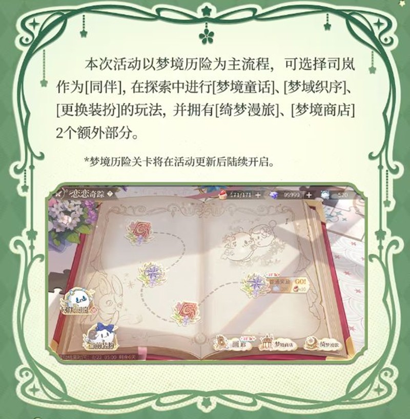 活动期间,玩家可以选择司岚作为同伴,共同在探索中进行梦境童话、梦域织序以及更换装扮的玩法。此外,还有绮梦漫旅和梦境商店两个额外部分等待玩家的发现。