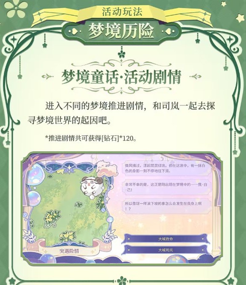 进入不同的梦境推进剧情,和司岚一起去探寻梦境世界的起因。推进剧情共可获得钻石*120。