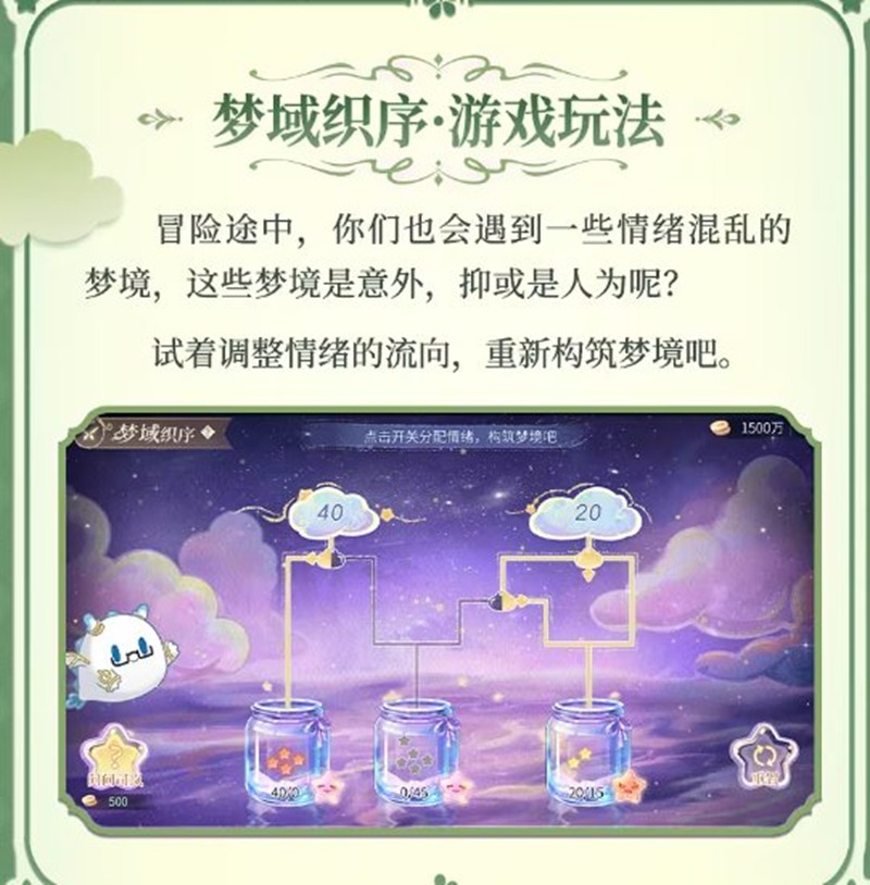 冒险途中,你们也会遇到一些情绪混乱的梦境,这些梦境是意外,抑或是人为呢?试着调整情绪的流向,重新构筑梦境吧。