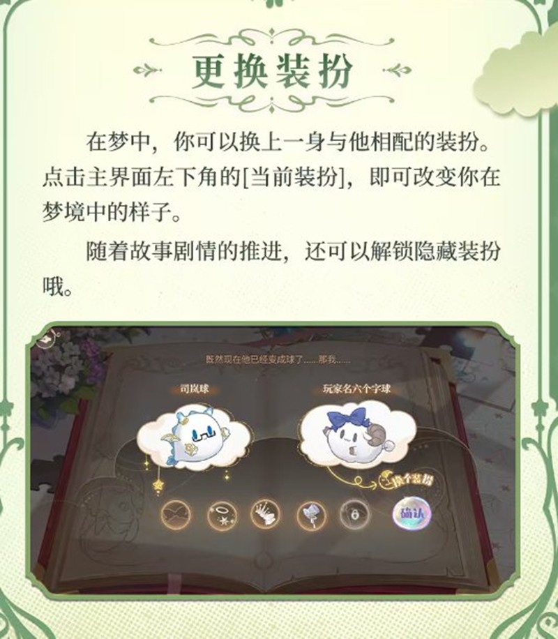 在梦中,你可以换上一身与他相配的装扮。点击主界面左下角的【当前装扮】,即可改变你在梦境中的样子。随着故事情节的推进,还可以解锁隐藏装扮哦。
