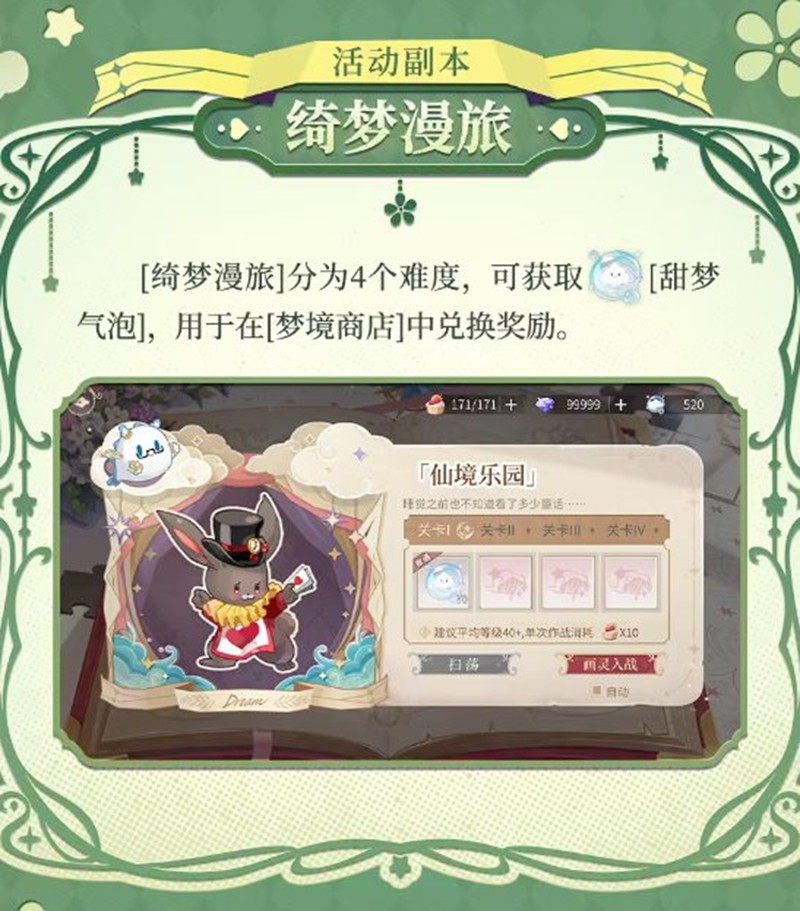 【绮梦漫旅】分为4个难度,可获取甜梦气泡,用于在梦境商店中兑换奖励。