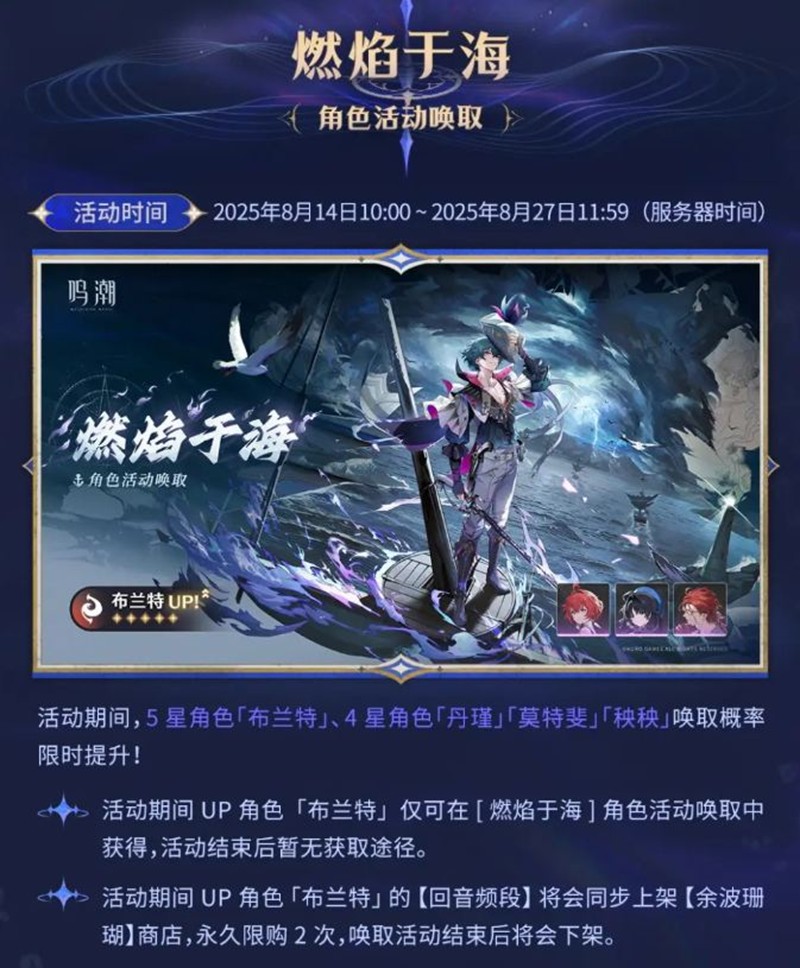 概率提升:活动期间,UP角色「布兰特」的唤取概率限时提升。