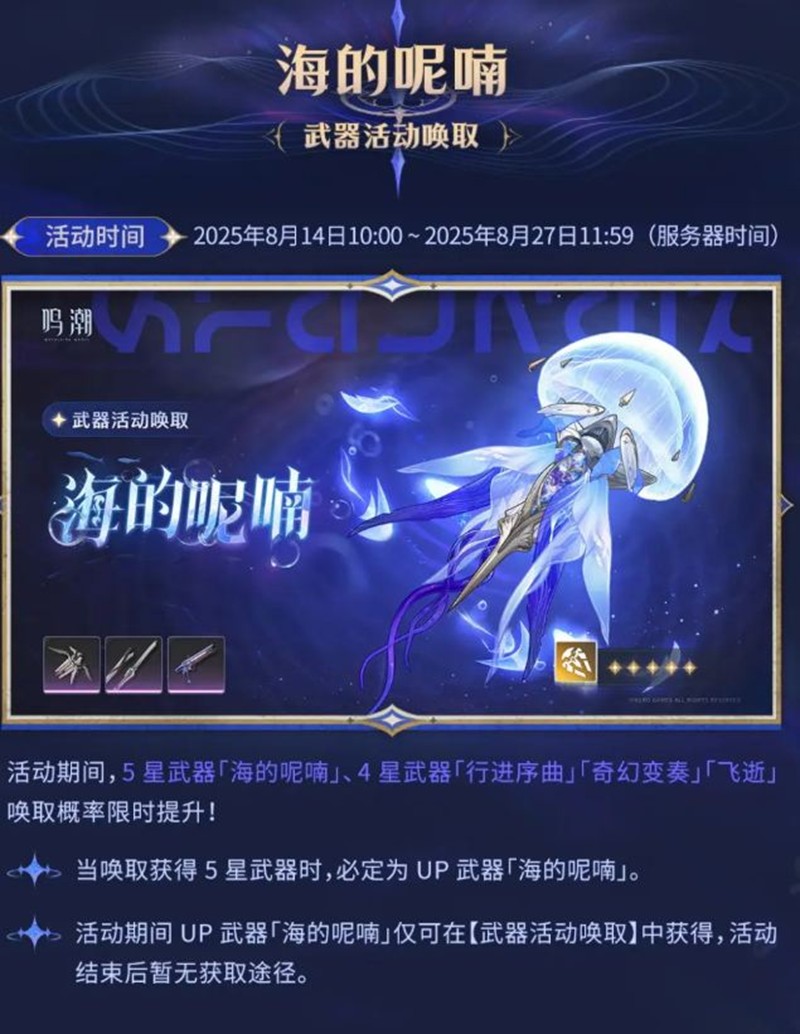 概率提升:活动期间,UP武器「海的呢喃」的唤取概率限时提升。
