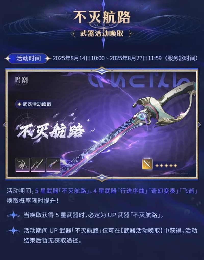 概率提升:活动期间,UP武器「不灭航路」的唤取概率限时提升。