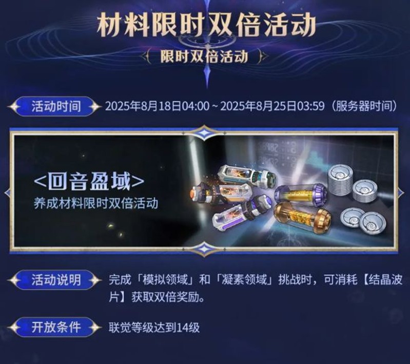 活动说明:完成「模拟领域」和「凝素领域」挑战时,可消耗「结晶波片」获取双倍奖励。