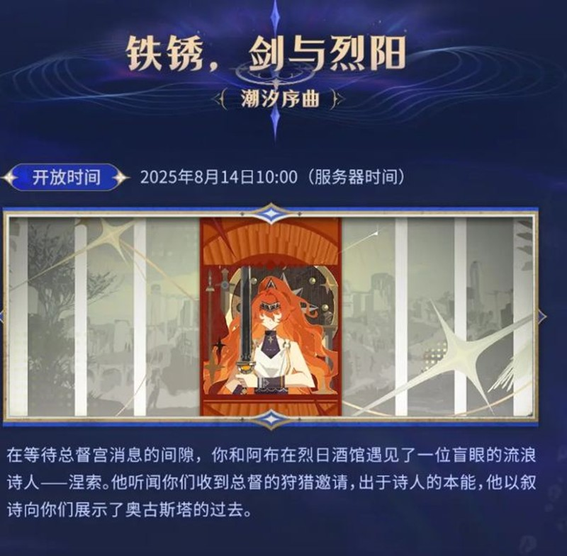 活动内容:在等待总督宫消息的间隙,你和阿布在烈日酒馆遇见了一位盲眼的流浪诗人——涅索。他听闻你们收到总督的狩猎邀请,出于诗人的本能,他以叙诗向你们展示了奥古斯塔的过去。