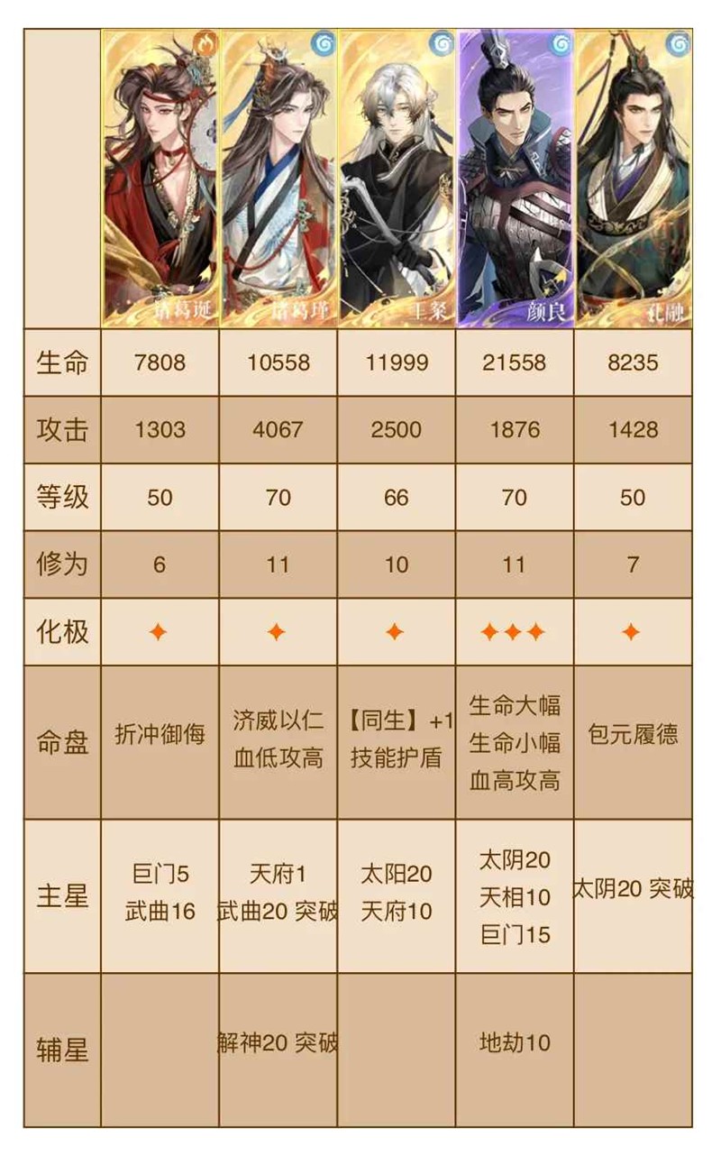 命盘和练度,看数值就好了,命盘刚需折冲和包元,其他随意。王粲可换史子眇,只是用来回血的。表格供参考。
