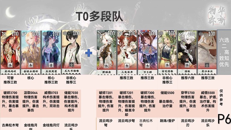 主流玩法,输出爆炸,抗伤能力略低,高难图对策解,金瓯焕彰配上王氏效果还不错,不过彩凤对于多段处于可有可无的存在。不过对于多段队来说还可以再加强。当前环境适配性一般。奶妈可替,商周加铜座龙【或者6931】可以和前四个搭配来提升队伍。
