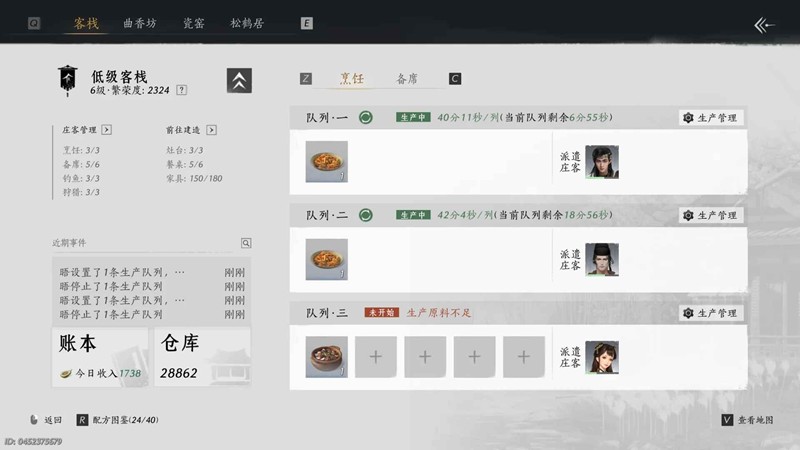 庄客食物:先用五级前的,等酒生产量超过6个时切换成6级酒 青红酒 设置为20%时使用