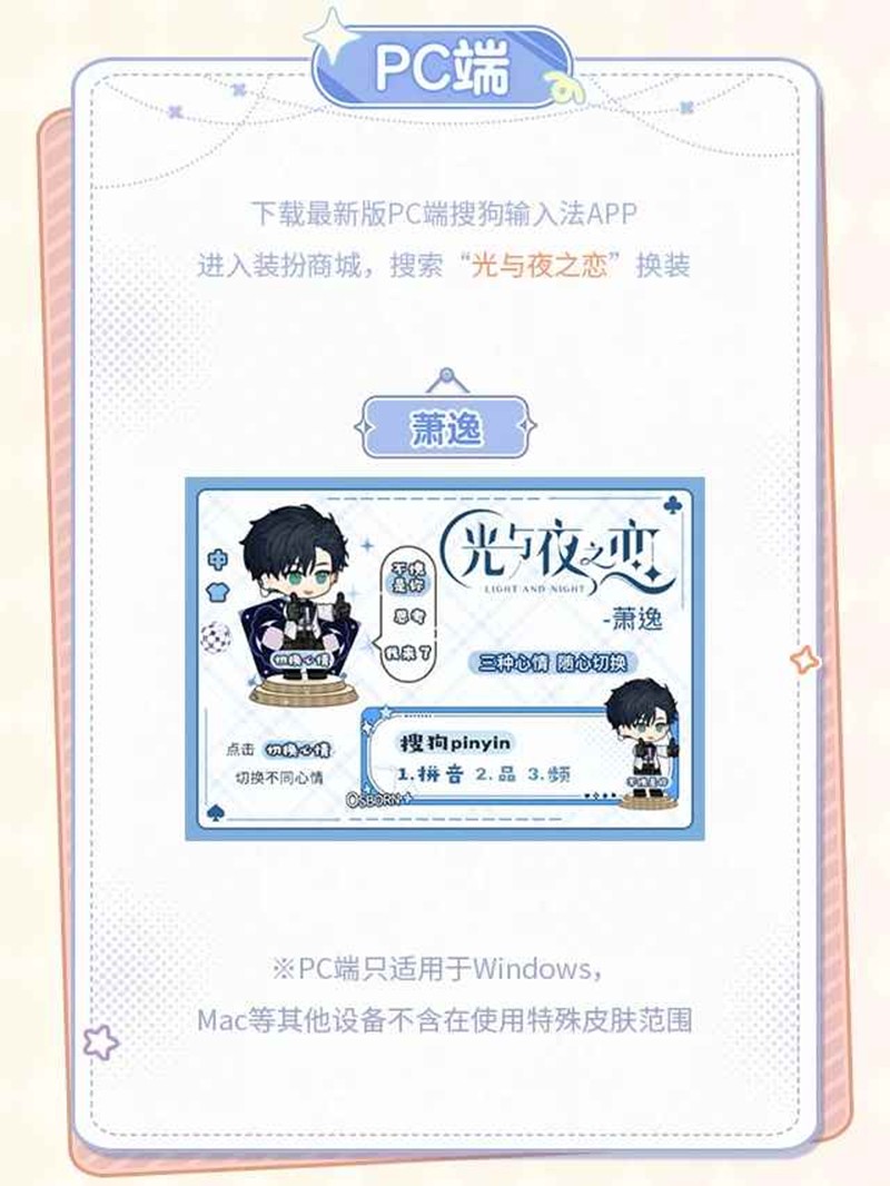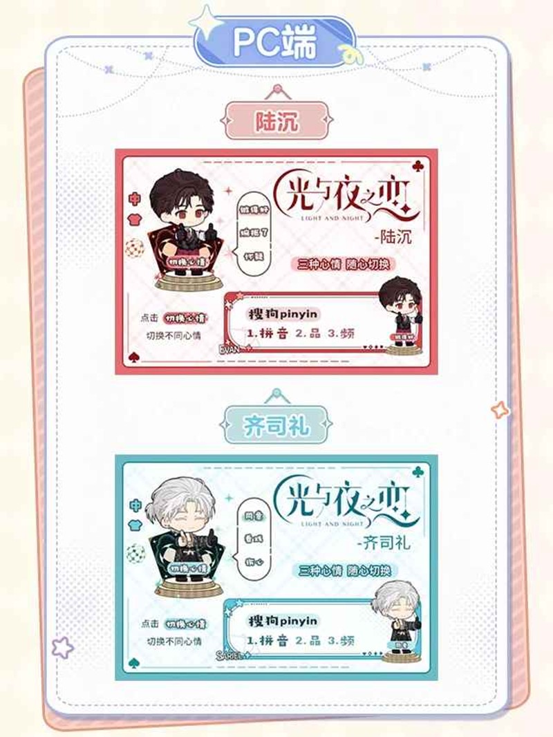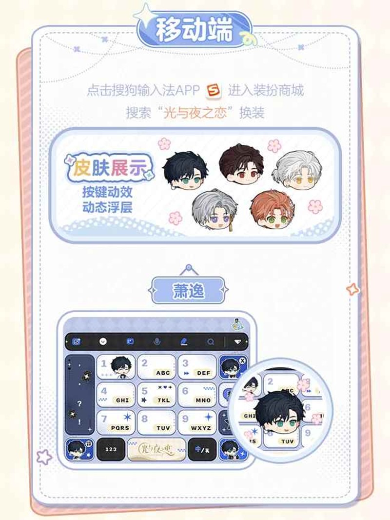 光与夜之恋 × 搜狗输入法联动已开启!Q萌皮肤免费领~移动端 · 【Q版浮层】【定制icon】,给你沉浸式恋爱体验,电脑端 · 三种形态可供切换,开启三倍心动模式。一起来和小编看看吧~