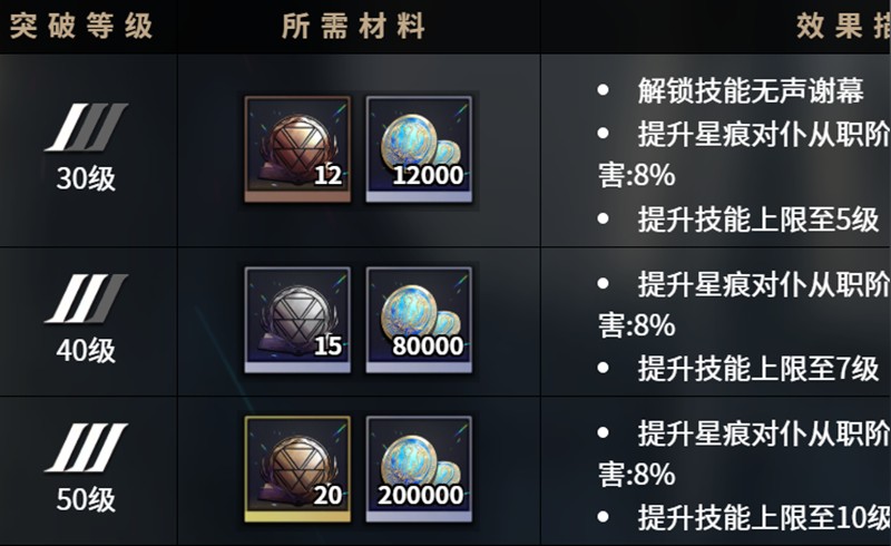 安娜的突破材料需求随等级提升而增加,30级需要12枚普通人子忆章和12000本勒,40级需要15枚精致人子忆章和80000本勒,50级则需要20枚豪华人子忆章和200000本勒。这些材料都需要提前准备。