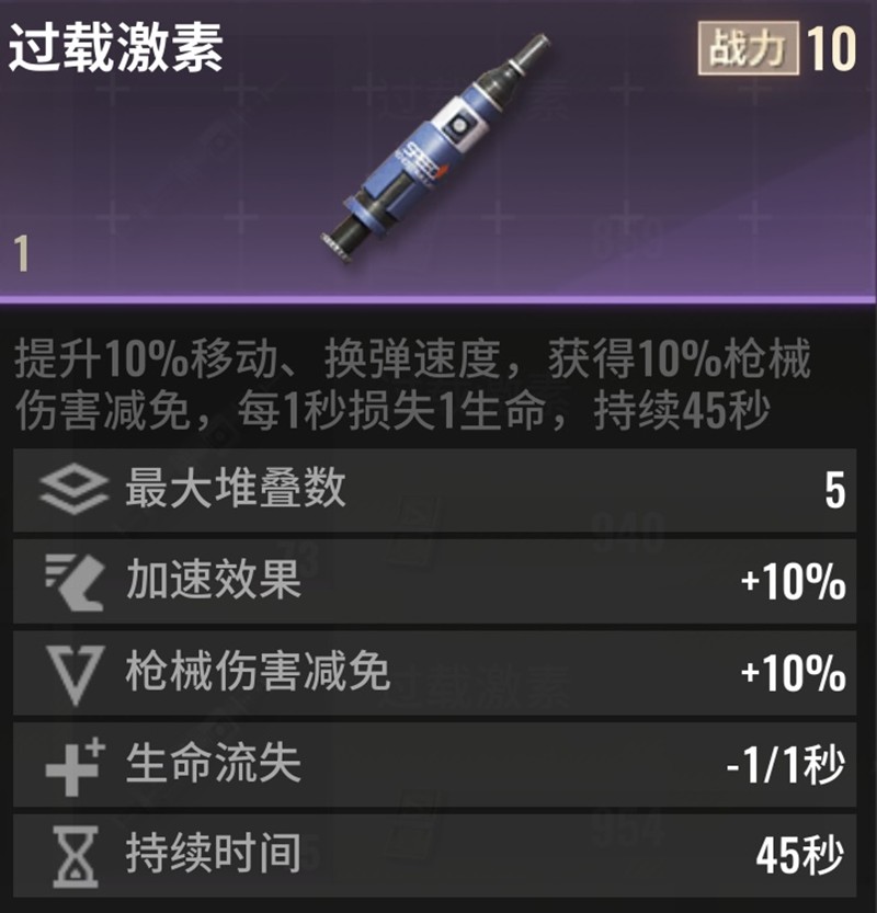 这个是超凡先锋中提升战斗能力的药品,注射后能显著提高攻击速度和移动速度。过载激素则能带来10%的移动速度加成和换弹速度提升,同时提供10%的伤害减免效果,持续时间长达45秒。镇静剂能增强听觉感知,同时降低射击时的武器抖动,让射击更加精准。