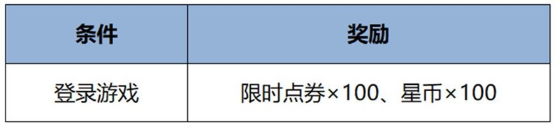 活动期间,任意登录1天游戏即可领取限时点券x100、星币x100