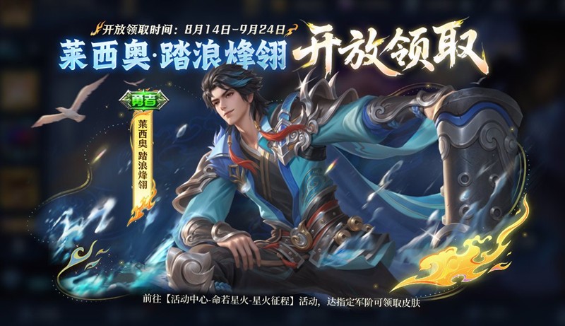 参与活动达指定军阶,8月14日10点起可领取莱西奥-踏浪烽翎皮肤!