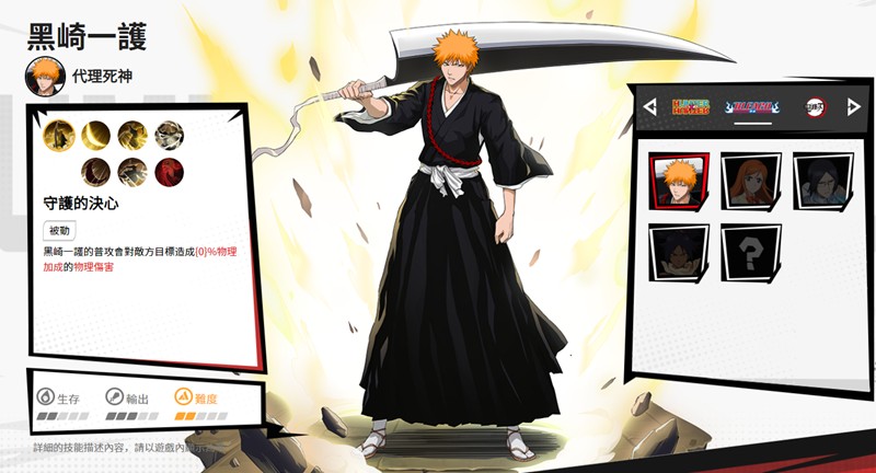 漫画群星大集结中的黑崎一护作为死神系列的代表角色,凭借独特的战斗机制吸引了不少玩家的关注。这位代理死神在游戏中属于T1级别的战士,虽然比不上某些T0角色,但依然拥有相当不错的战斗表现。