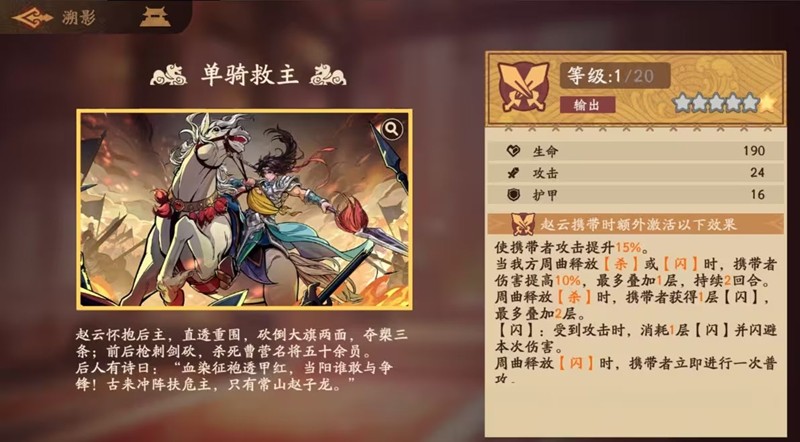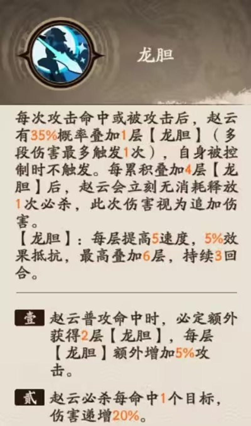 小杀月旦评:从天赋可以看出,子龙是一位可以分担身前队友伤害,提升自己输出,高频率必杀输出的战士,龙胆还可以提升速度跟效果抵抗,完美契合了子龙的无双之勇正所谓:子龙一身都是胆,更有仁心并义肝、