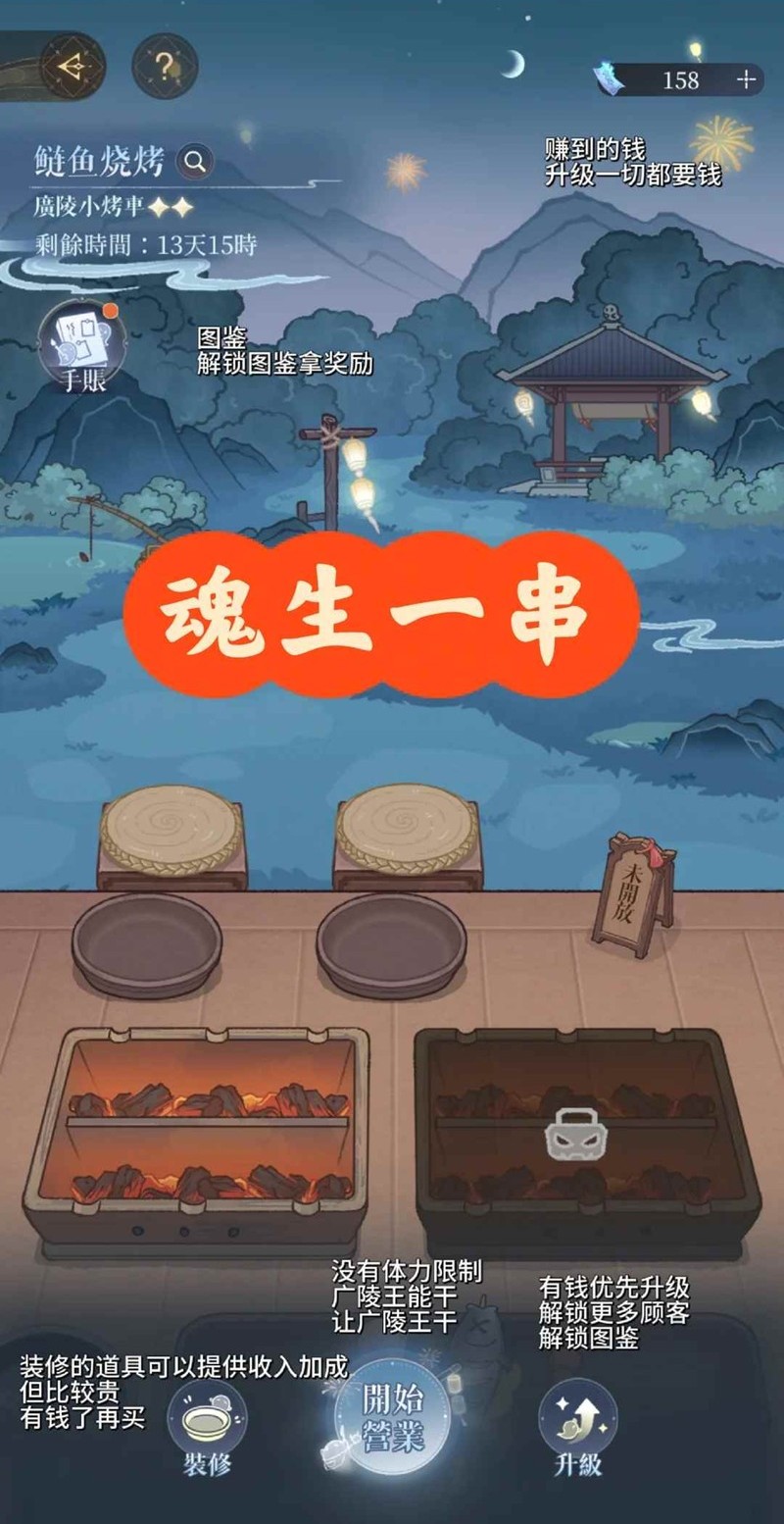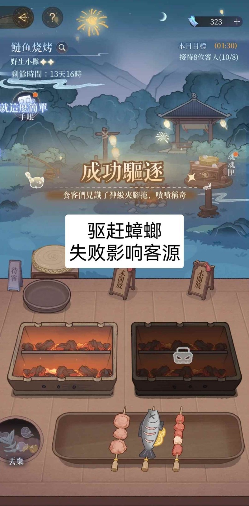 点击开始营业后根据顾客的需求提供对应的烧烤(注意陈登需要的是生鱼,需要在变色前拖给他