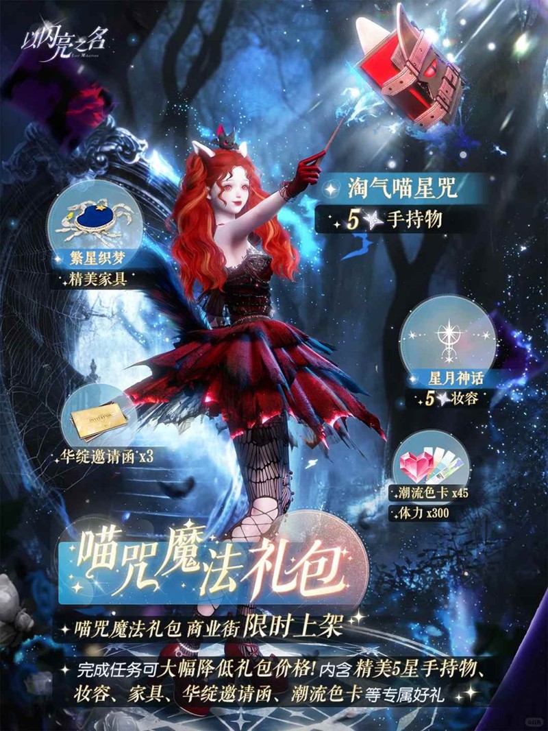 以闪亮之名【复刻】喵咒魔法礼包限时特别开启!8月15日-8月22日,礼包内含五星限定手持【淘气喵星咒】、五星妆容【星月神话】、精美家具【繁星织梦】、华绽邀请函*3、体力*300和潮流色卡*45,一起来看看吧~喵!来一些甜蜜的魔咒吧~