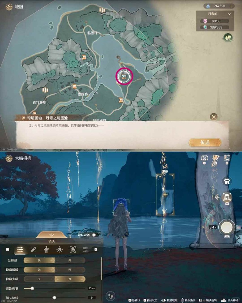 画中世界「奇境画轴·丹青之境墨池」锚点,传送过来就可以拍到瀑布照片了