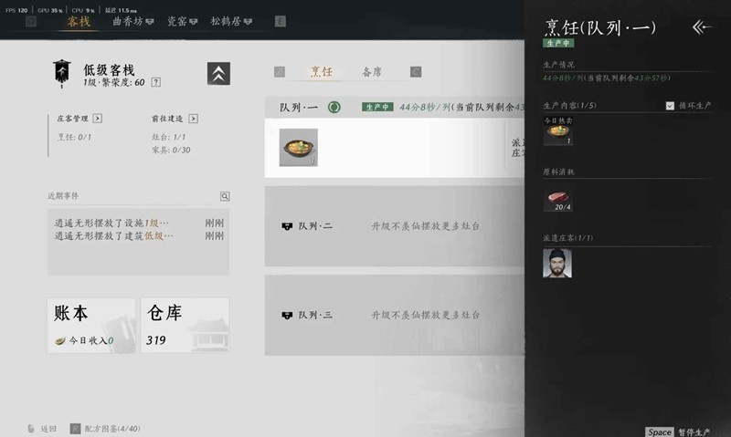接下来第一天还需要做的事是建造客栈和灶台去家业里面升级到2级家业建造餐桌烹饪勾选米叔+土豆煨肉+循环生产备席选喜儿+土豆煨肉+不要循环生产做完三轮少东家的一天,完成开坛宴