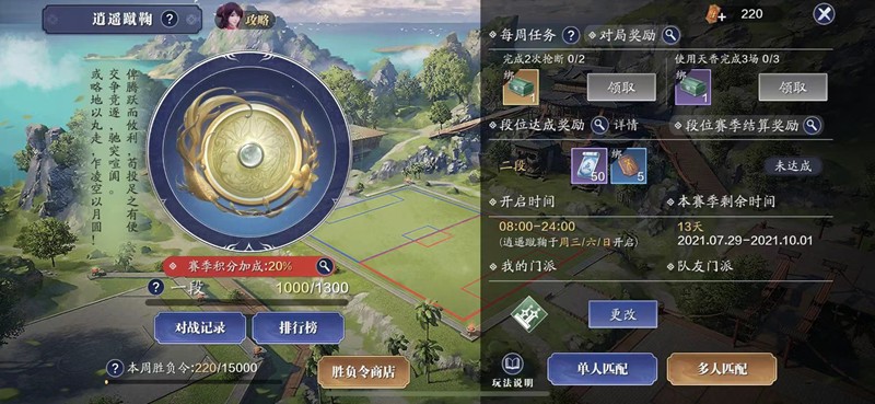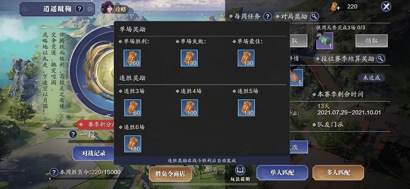 逍遥蹴鞠采用3v3对战模式,每局比赛限时6分钟。比赛以进球数决定胜负,先打进5球的队伍将直接获胜。胜利方可以获得260胜负令,失败方获得130胜负令。表现优异的玩家还能额外获得130胜负令奖励,这些胜负令可以用来兑换珍贵道具。
