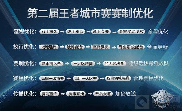 四、赛程优化:从9月3日至12月初,每一周的周六、周日“第二届王者城市赛”将前往各大城市选拔城市王者。9月底的南方大区区域赛、10月底的北方大区区域赛、11月底的华西大区区域赛,将从城市王者中选拔区域王者。而从区域赛脱颖而出的六支强队方可获得加入12月初展开的“城市赛总决赛”入场券!