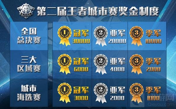 第二届王者城市赛依然为前来一展身手的王者召唤师准备了丰厚的游戏礼包,以犒赏拥有圆梦之勇的赤子之心。而在本届比赛中脱颖而出的城市王者、区域王者、总决赛冠亚季军都将获得高额奖金福利!每一个城市海选赛的冠亚季军将分别获得3000元、2000元、1000元奖金!每一个大区区域赛的冠军将获得6000元奖金、亚军将获得4000元奖金!而在12月初举行的总决赛中,斩获冠亚季军的终极王者将分别获得30000元、20000元、10000元奖金!全面升级的参赛奖励将为王者召唤师们的荣耀加冕,游戏内也将发放专属游戏头像框,进一步增加玩家荣誉感!