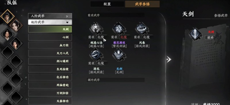 天剑武学由五个需求武学组合而成,分别是砚溪心法、梨花满枝、风卷、游龙和无剑。玩家可以在武学参悟界面查看这些需求武学。砚溪心法是最容易获得的,只要加入砚溪山庄就能自动获取。游龙和风卷在新手时期的地宫中就能找到,获取时间较早。
