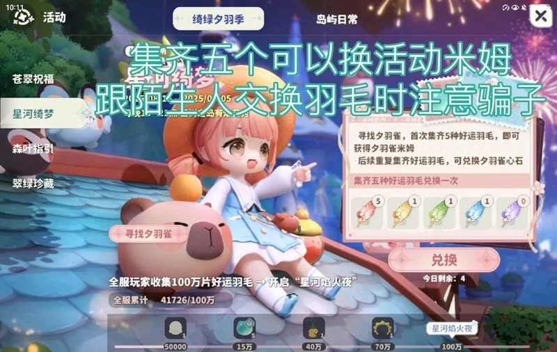 集齐五种不同的羽毛就可以换取活动米姆了