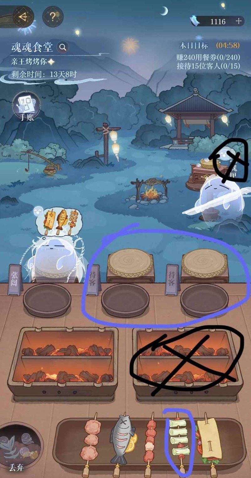 5.生串/糊串 用1块钱的四葱串 最多一个魂喂三个 也可以丢掉都算次数 (喂四个魂会气炸 魂就全跑了要等一会再来魂 不建议 如果手滑没关系慢慢做就好