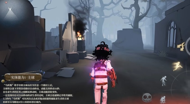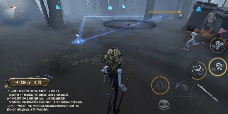 “马库斯”将手中的主球击打至任意一个路径上后,主球将会落下并将沿着路径自动移动,动能支持移动16秒。在有求生者的狂欢之椅附近移动时,主球动能消耗变快。一定范围内有可自由移动的求生者经过时,主球会迅速锁定并将其捕捉。3.5秒内“马库斯”可以再次点击或者拖动按键将捕捉求生者的主球转移至自身附近8至11米的环形区域内。