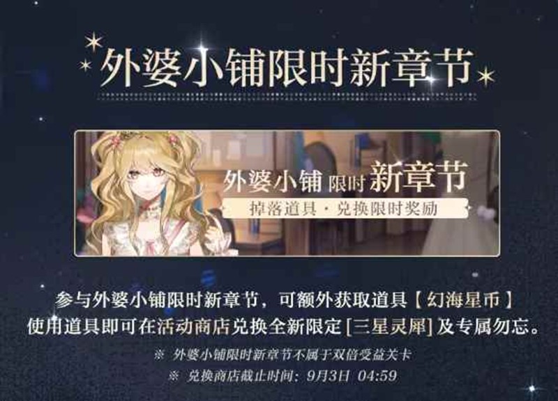 8月20日05:00-9月2日04:59期间,参与外婆小铺限时新章节,可额外获取道具【幻海星币】,使用道具即可在活动商店兑换全新限定[三星灵犀]及专属勿忘——