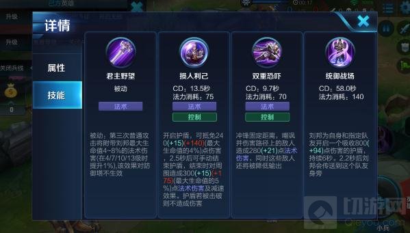 君主野望(被动):第三次普通攻击将附带刘邦最大生命值4-8%的法术伤害,该效果对防御塔不生效。