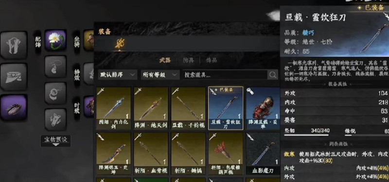 这本秘籍还具备特殊武学特性。寒气效果能造成额外伤害并增加属性,同时减少阳属性收益。护体真气可以抵挡20%伤害,必中效果能在攻击后持续两个回合。搭配绝世七阶武器雪饮狂刀使用效果更佳,这把武器拥有340点耐久度,是傲寒六诀的绝佳搭档。