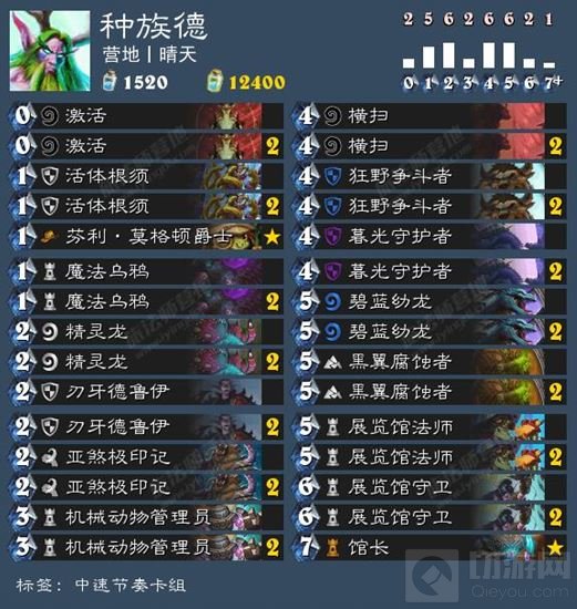 同时,馆长这张卡的设计引出了三种族的卡组思路,也就是后文我构筑的这套卡组的思路。我的构筑思路是组出一套像上古时期的冠军贼、像当今的龙战这样的中速节奏卡组(中速卡组和节奏卡组的特性,简单讲就是前者生物质量极高、后者赚取费用能力极强,个人理解就是,好的中速卡组必须要有很强的抢节奏能力,好的节奏卡组也需要好的中速卡组那样的生物质量,所以我把卡组风格定义为中速节奏卡组。名可名,非常名,笔者不想在这里讨论定义,我们的思想就是质量+赚费,明白这点就可以了)