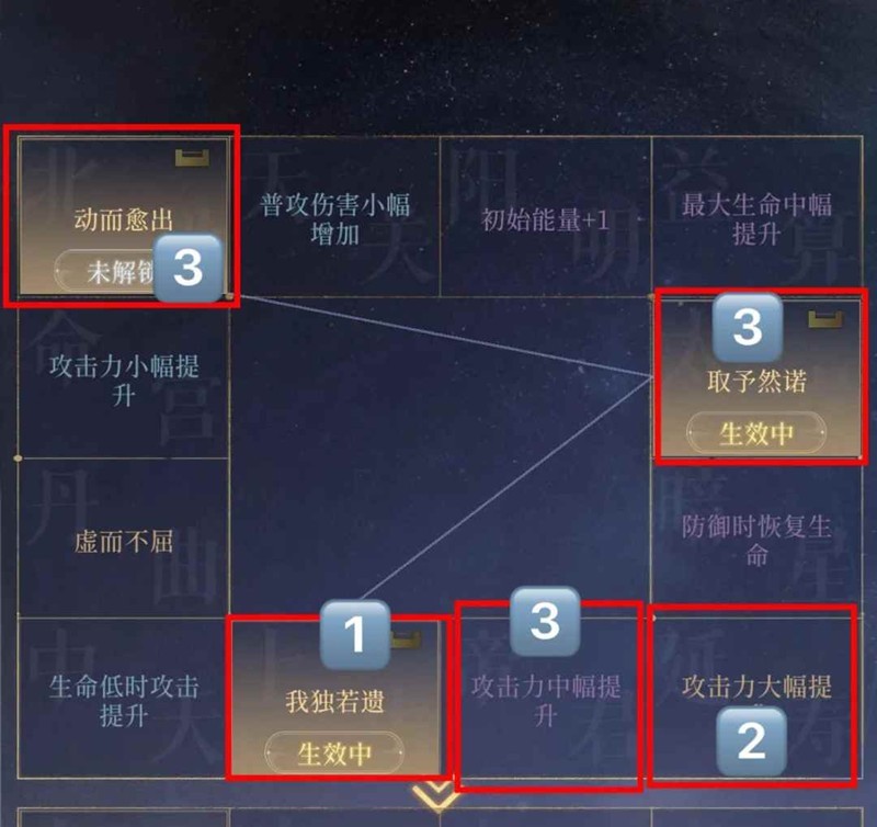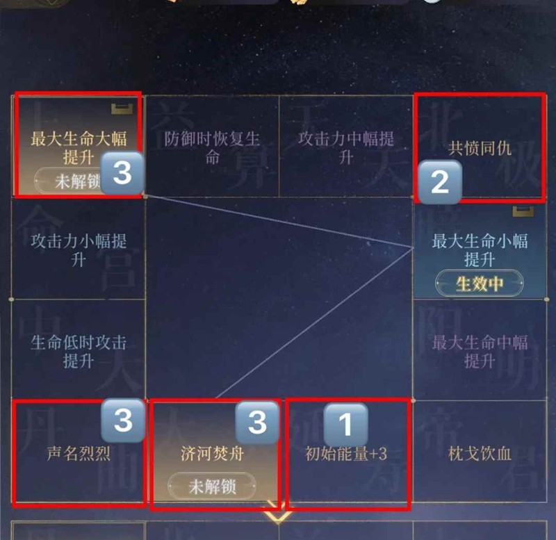 凌统命盘1推荐:【能量加3】+【共愤同仇】+【济河焚舟/生命大幅/声名烈烈】,核心【共愤同仇】+【济河焚舟】