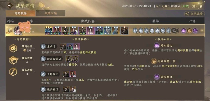 于是就有了图二的拼好阵,主包实战的时候是激活了八个羁绊。然后就是金币不断的增加,最高经济是有600+。