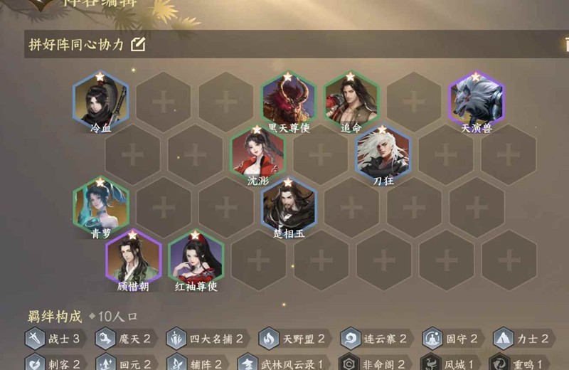 主包研究了一下十人口最多可以有多少羁绊,这应该是同心协力的极限了一一十人口十一个羁绊。