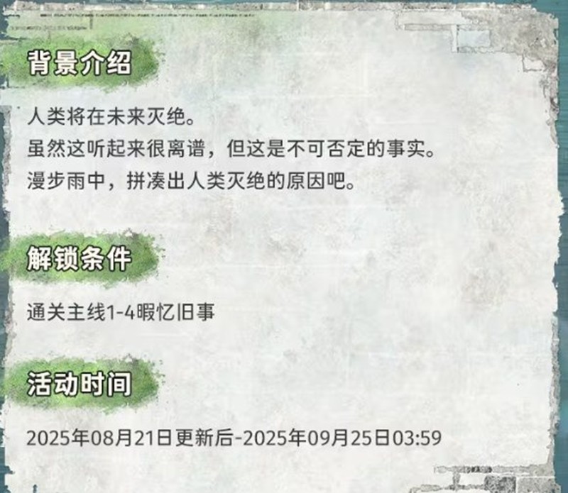 活动背景设定在一个似乎与现实世界有一定同步度的奇怪世界,其中生活着不同种类的超实体生物。玩家需要在这个世界中探索,了解人类灭绝的原因。虽然听起来很离谱,但这是不可否认的事实。玩家将漫步雨中,拼凑出人类灭绝的原因。