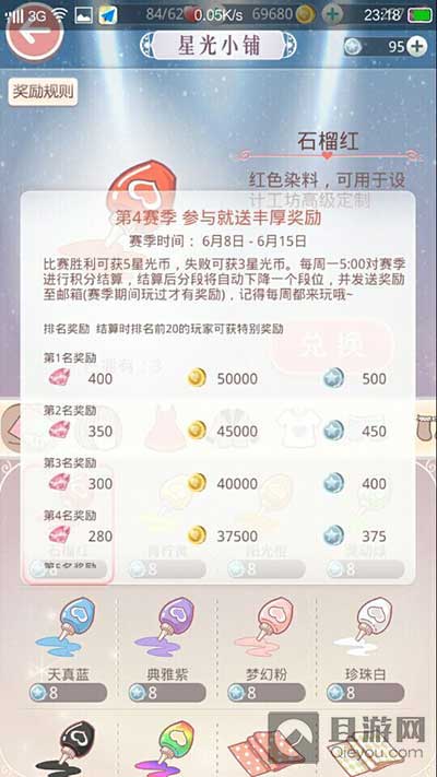 搭配竞技场跟《暖暖环游世界》里的评选赛是差不多的,玩家【登上舞台】和别的玩家进行PK,可以获得积分和星光币的奖励。星光币是可以在星光小铺中兑换各种服饰材料的噢!每天PK5次,每周更新排名。谁是搭配王国的女王?挑战一下,你就知道啦!