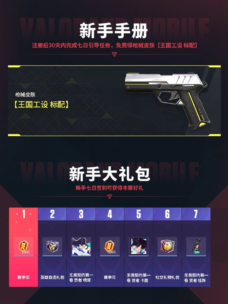 新手七日签到可获得丰厚好礼,包括赛季币、英雄自选礼包、无畏契约第一卷贤者喷漆、赛季币、无畏契约第一卷贤者卡面、社交礼物礼包以及无畏契约第一卷贤者挂饰。