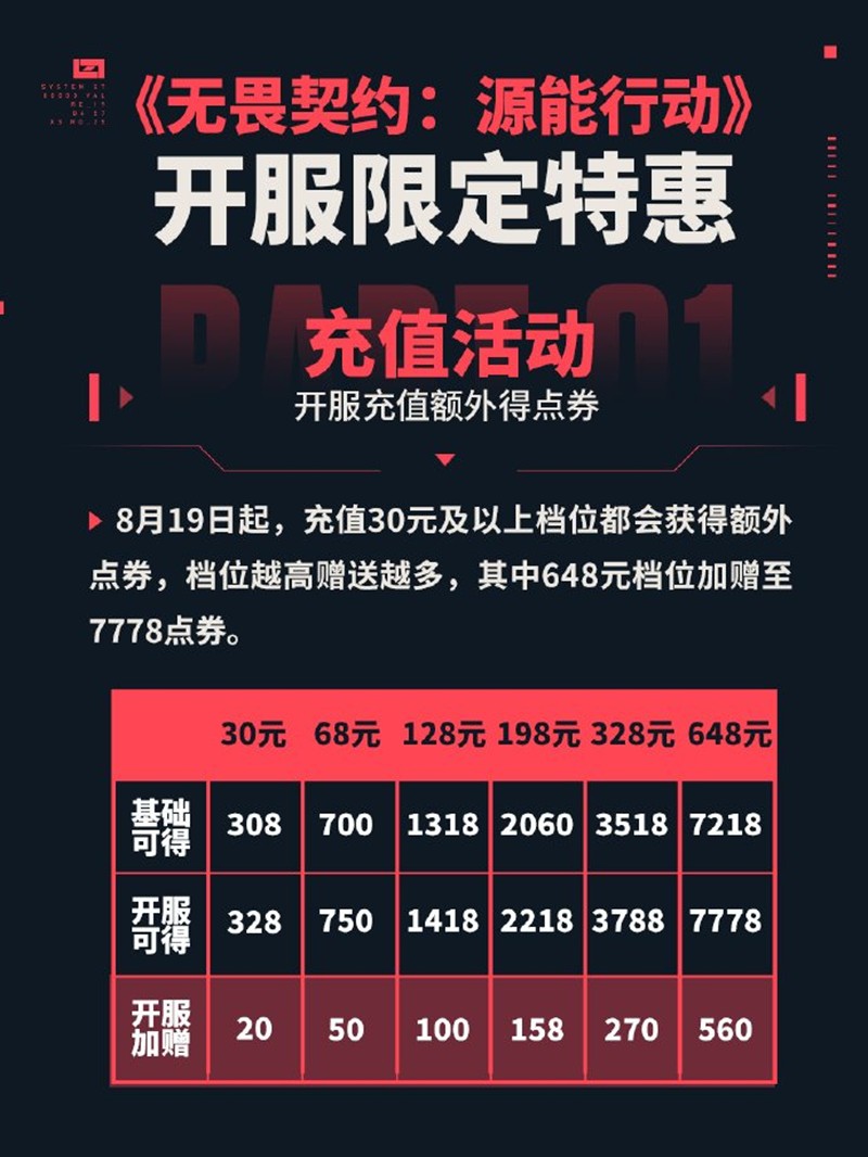 8月19日起,充值30元及以上档位都会获得额外点券,档位越高赠送越多,其中648元档位加赠至7778点券。
