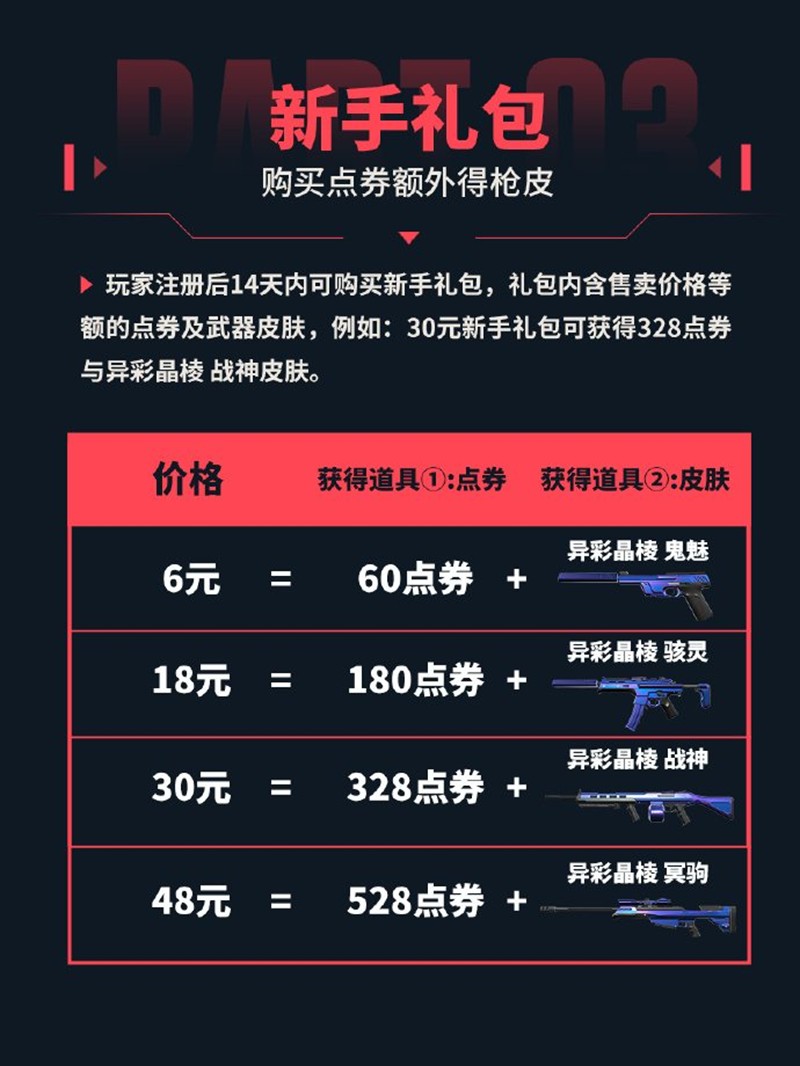 玩家注册后14天内可购买新手礼包,礼包内含售卖价格等额的点券及武器皮肤,例如:30元新手礼包可获得328点券与异彩晶棱II狂徒。