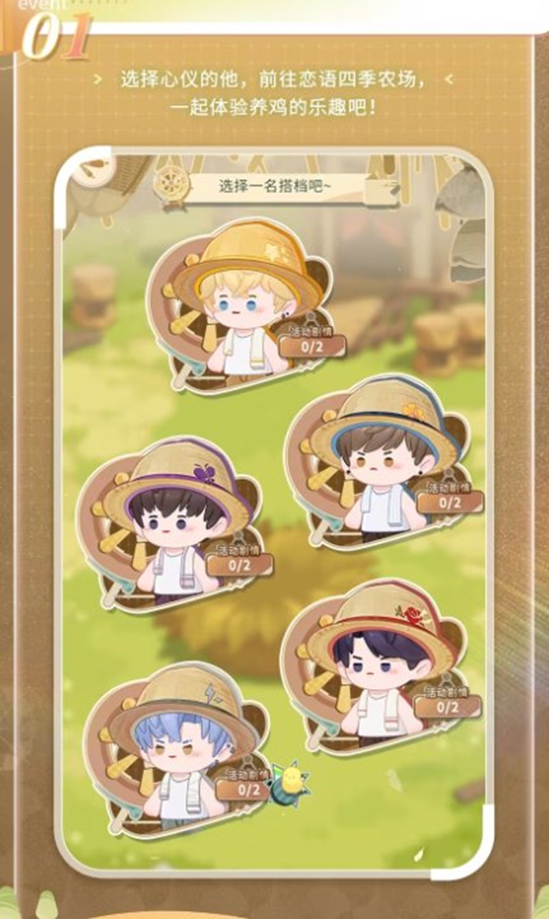 玩家首先需要选择一名心仪的角色作为搭档,一同前往“恋语四季农场”。每位角色都拥有独特的活动剧情,玩家可以通过完成养鸡计划来解锁这些剧情。